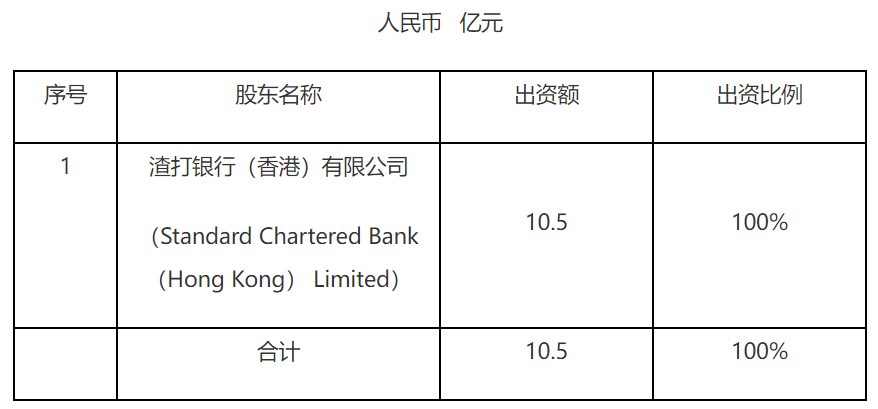 证监会网站1月19日消息,核准设立渣打证券(中国)有限公司(以下简称渣打证券)。渣打证券注册地为北京市,注册资本为人民币10.5亿元,业务范围为证券经纪、证券自营、证券承销、证券资产管理(限于从事资产证券化业务),股东名称及出资额、出资比例如下: