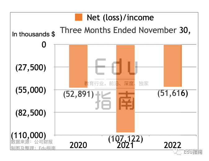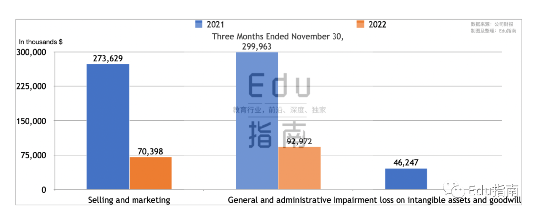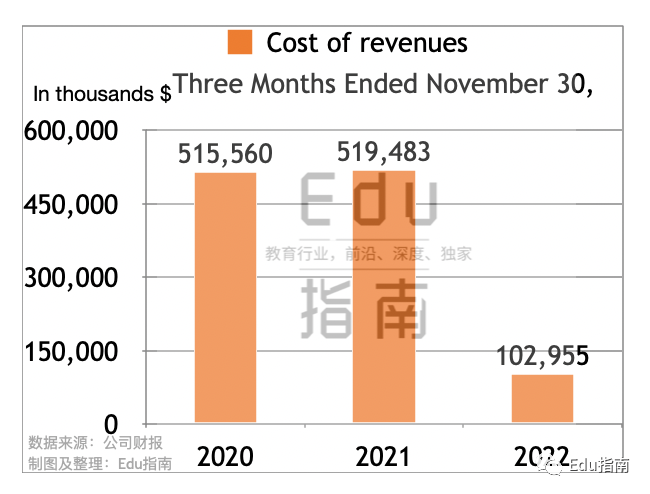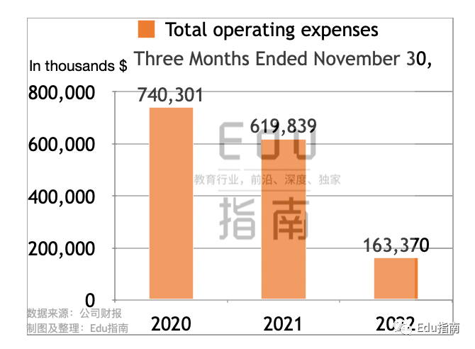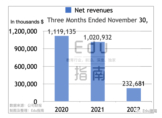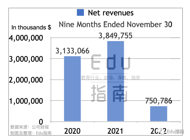 更早之前的2022年2月,该公司在其财报中表示预计停止K9业务将对公司财年收入产生重大不利影响(截至2022年2月和随后的时期),因为K9学科辅导此前是该公司最重要的收入来源之一。 同年4月份,该公司发布其财季业绩,季度营收为5.4亿美元,同比降60%。该营收数值是其近4年同期最低的营收数值。8月,该公司发布截至2022年5月(2023财年第一季度)财季业绩,该财季营收2.2亿美元,同比降84%。该季度营收数值表现为近6个财年同期最低。同年10月,该公司发布其2023财年二季度业绩,营收2.9亿美元,同比降80%。
