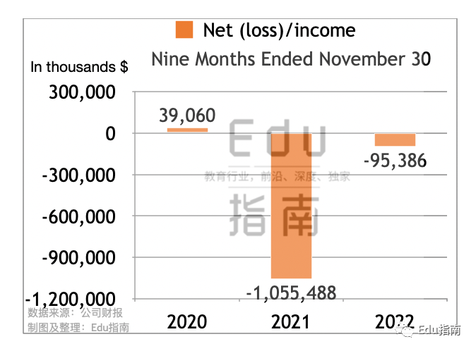 2023财年前九个月好未来公司净亏损为9539万美元,上一财年同期为净亏损10.6亿美元,即本财年该时期净亏损同比收缩91%。2021财年前九个月该公司表现为净盈利3906万美元。