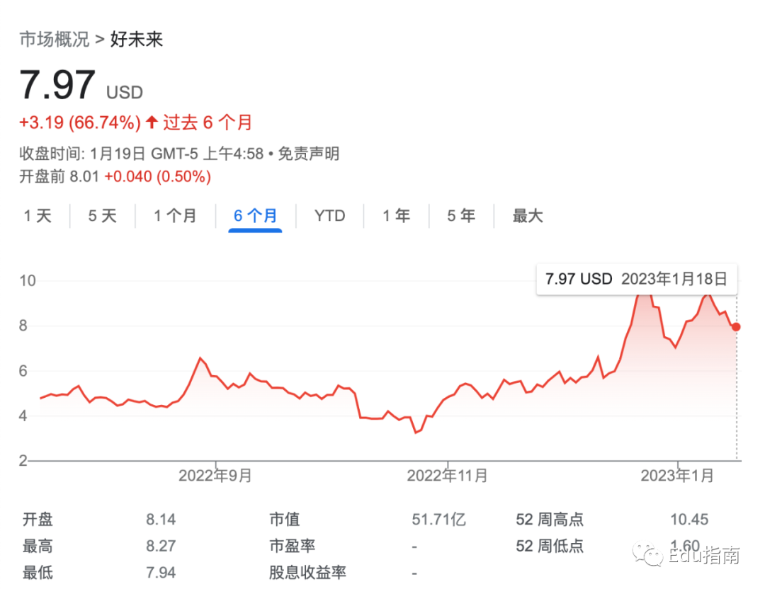 关于好未来,该公司为各个年龄段的学生提供全面的学习服务,涵盖进修课程和进出大学的学术科目。该公司于2010于纽交所上市, 过去半年股价上升67%,当前市值为51.7亿美元。