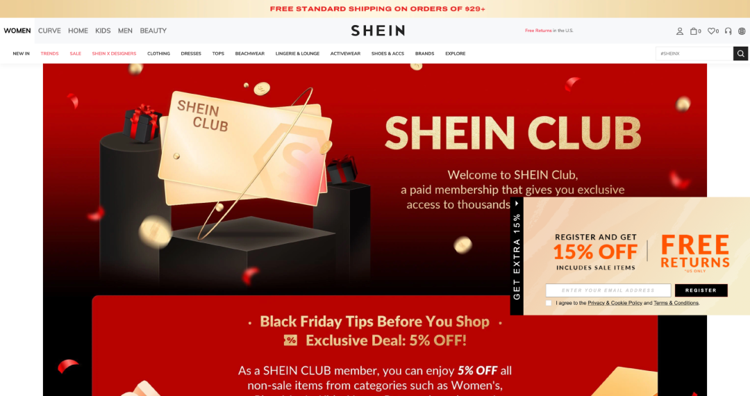 2022年10月2日,搜索引擎爬虫收录了一个新网址,这是SHEIN最新推出的会员订阅制服务“SHEIN Club”的入口。点开SHEIN Club官网的一瞬间,充满诱惑的配色就开始刺激用户眼球,巨大的15%折扣券、退货免运费的广告漂浮在屏幕右侧。