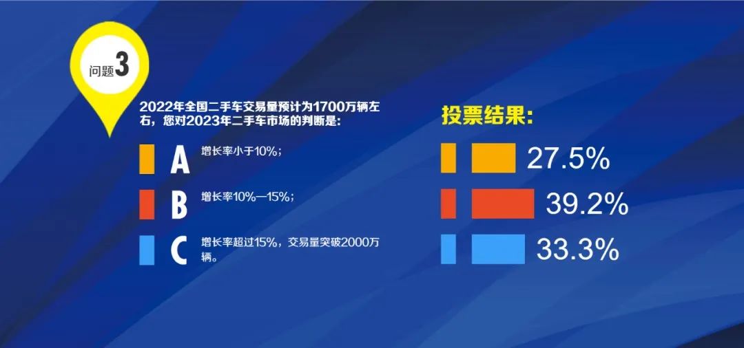 对于2023全年汽车市场的判断结果来看,在中国汽车流通协会的行业年会上的投票结果来看,有18.3%的嘉宾认为明年汽车市场将是5%以内的负增长;有一半以上的嘉宾60.9%的人认为明年汽车市场增长幅度在0-5%;还有20.8%的嘉宾持有更积极的态度,认为明年汽车市场预期增长幅度在5%以上。