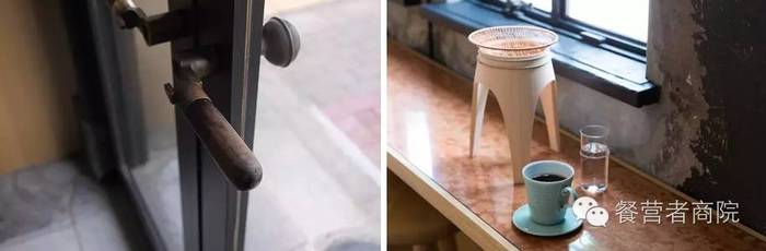 木制门把手是将原市营电车的刹车杆赋予新生命,与同样百年老店的金网细工、中川木工艺开发日本特有的滴滤式咖啡壶和滤网架,玻璃杯亦使用手工吹制玻璃的工坊PONTE。