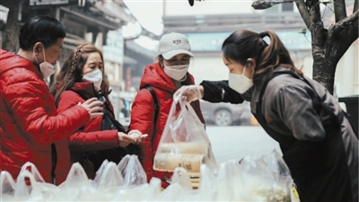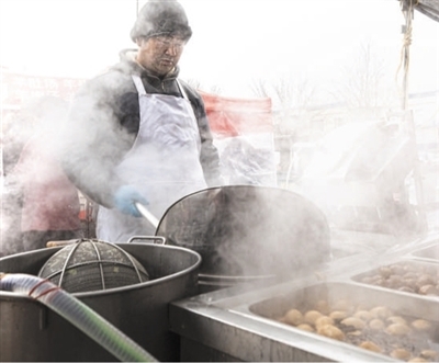 1月13日,北京市通州区漷县镇,个体户正在农贸市场上制作、售卖刚刚出锅的年俗食品。 张寅生摄(人民视觉)