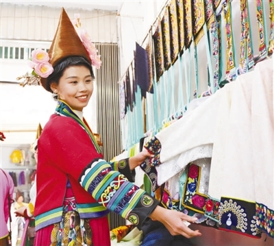 广西壮族自治区柳州市融水苗族自治县良寨乡,一名顾客在集市选购新衣。 龙 涛摄(影像中国)