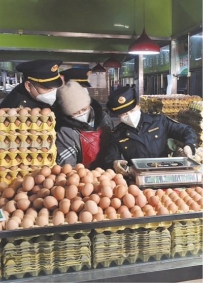 1月13日,河北省石家庄市新华区,市场监管人员在朝阳路一农贸市场里的摊位前检查台秤。 史自强 李鹏茹摄影报道