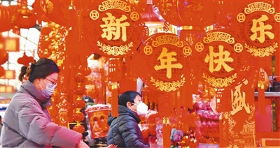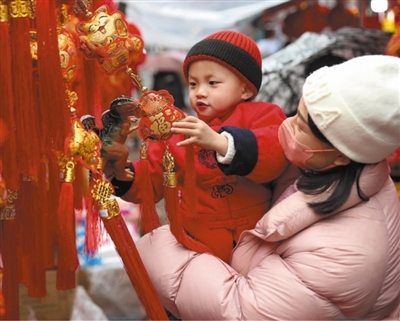 1月14日,贵州省铜仁市玉屏侗族自治县年货市场上,市民带着孩子挑选春节装饰品。 胡攀学摄(人民视觉)