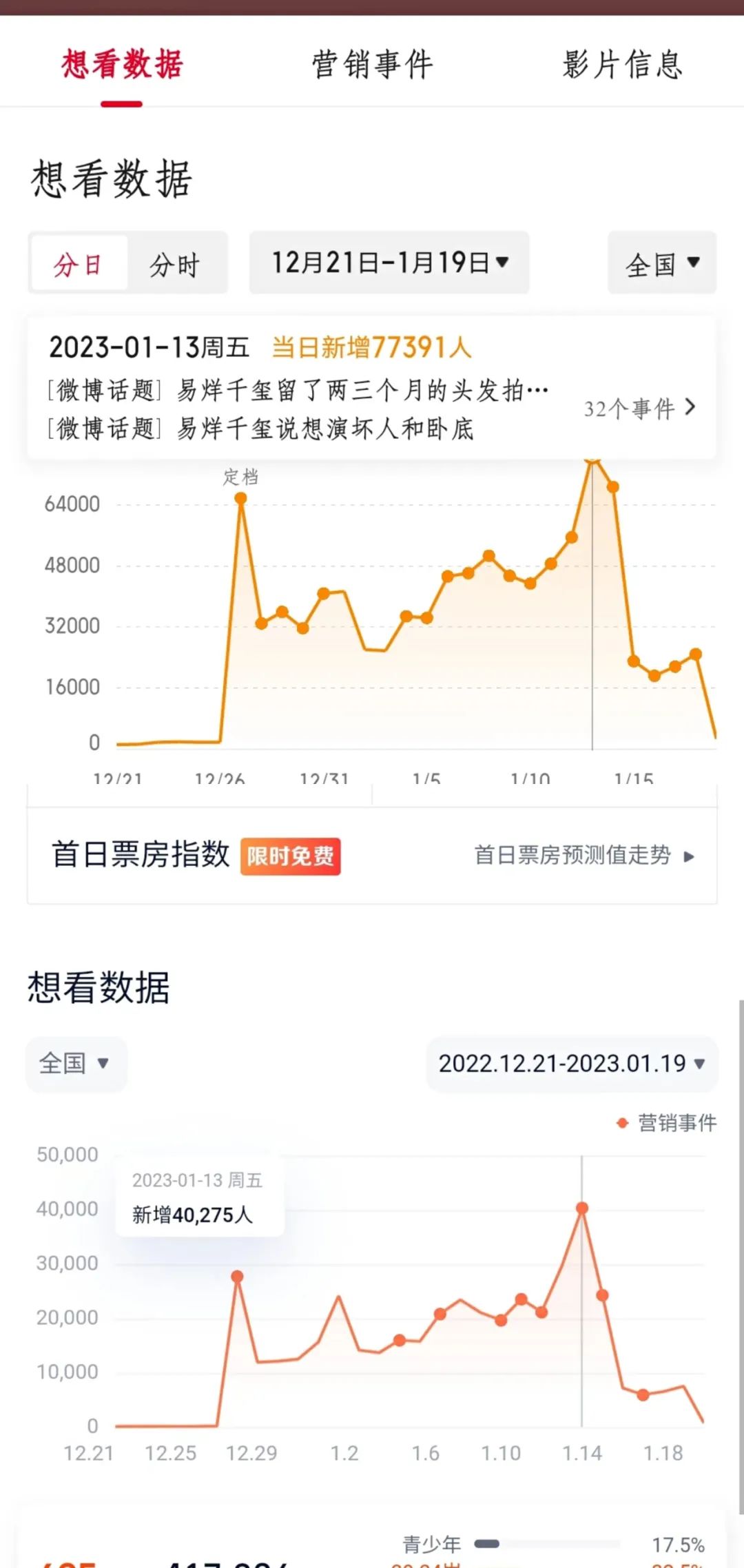 《满江红》则因为有流量明星的参与,在宣传中抓住这一优势,以此来增加热度。在定档当日,除了发布首支预告片之外,在抖音和微博的话题均以演员阵容为主,其中和易烊千玺相关的接近一半,呈现出和流量明显紧密绑定的关系,猫眼新增想看人数65000多人。