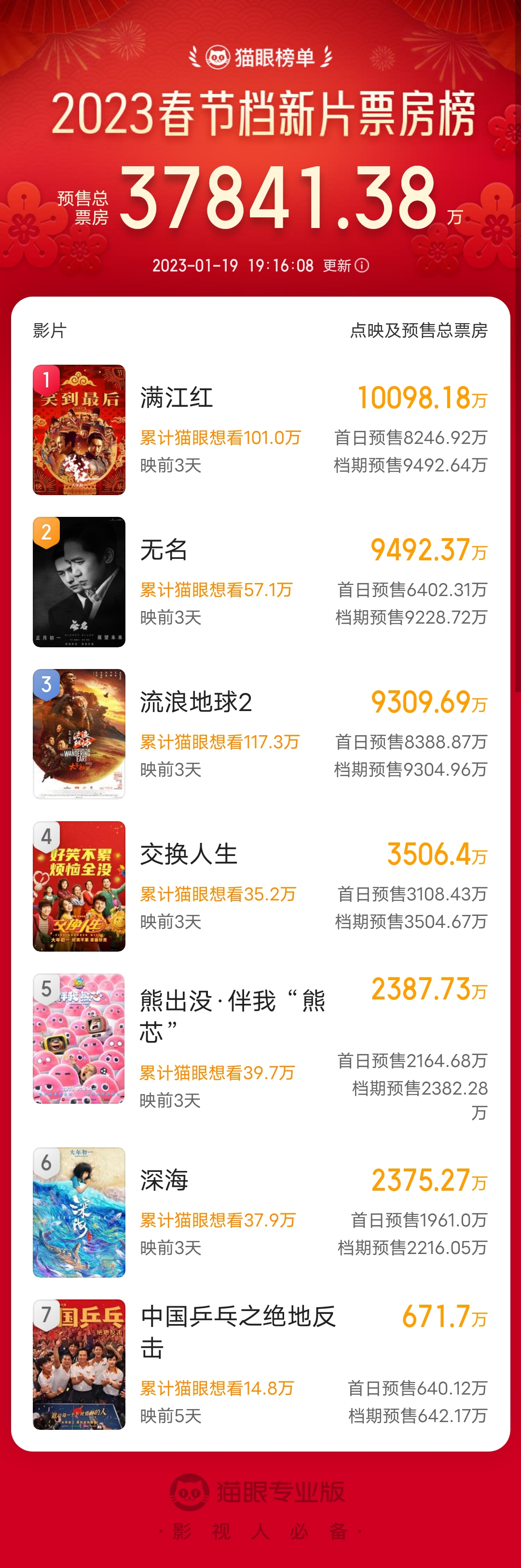 电影档期之战,首重排片。对于很多低频次观影的人群来说,春节档是他们一年中仅有的走进电影院的时刻。只有尽可能多的争取排片,才能更好地吸引这些观众,拉高电影的整体票房。在今年的春节档,《流浪地球2》因为上一部在票房上的成功,影城方面比较看好,对观众也有较强的吸引力。而《满江红》和《无名》因为有流量明星的参与,所以粉丝对于开画首日冲排片是很积极的。今年春节档对首日排片的争夺,主要集中在这三部电影中间。