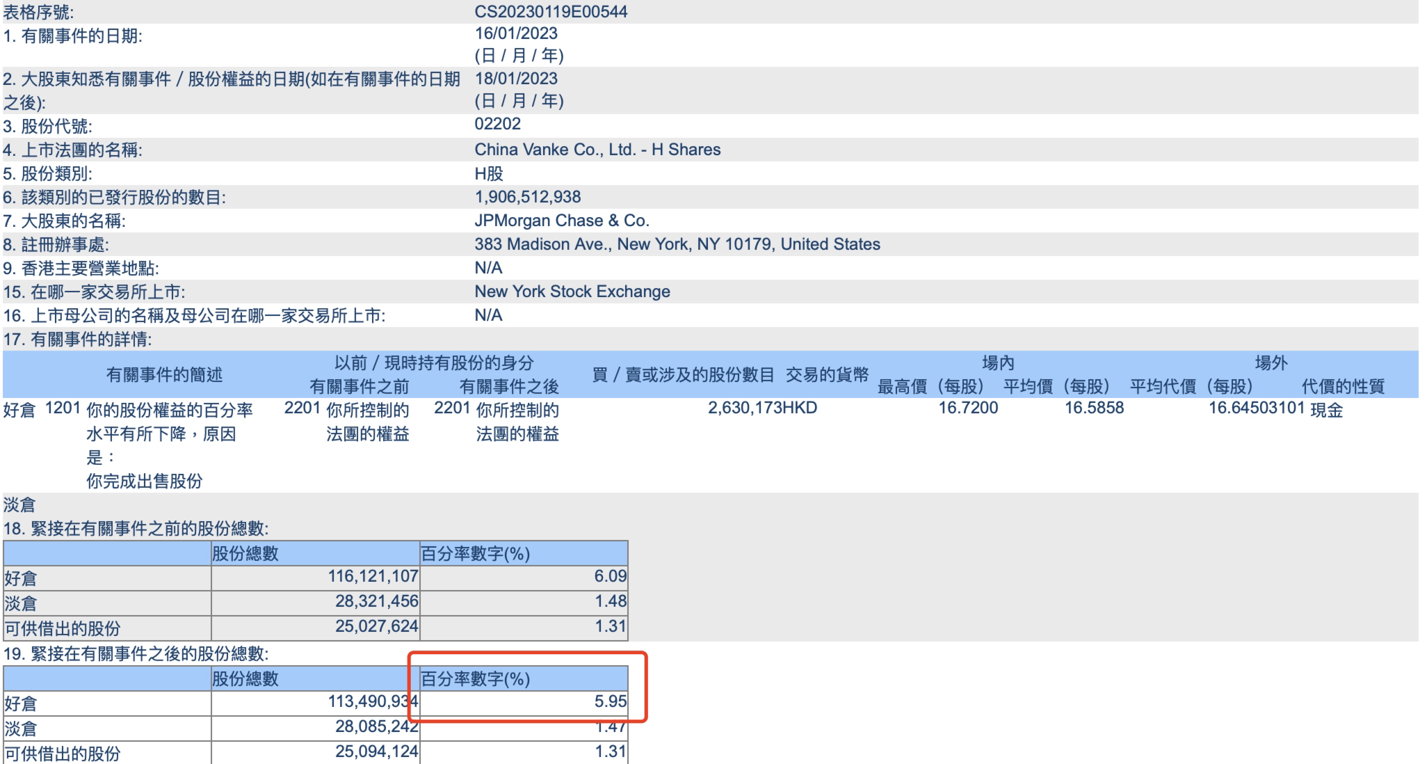 万科企业:摩根大通持股比例从6.09%降至5.95%