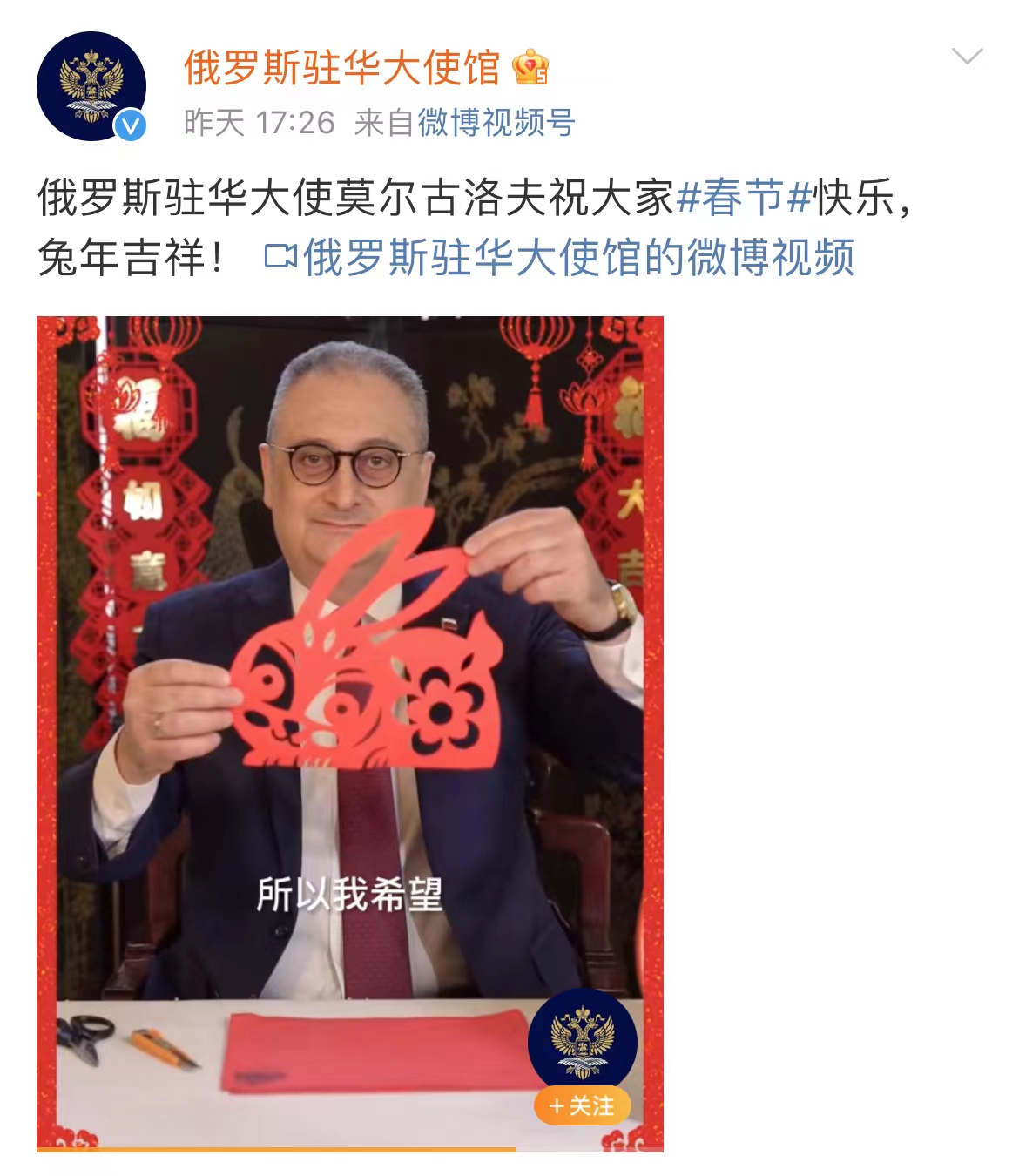 据@俄罗斯驻华大使馆 微博1月20日消息,俄罗斯驻华大使莫尔古洛夫发布拜年视频,视频中莫尔古洛夫大使用中国传统剪纸工艺在红纸上刻出了一个兔子形象,并在门上贴上一个代表幸福的“福”字。