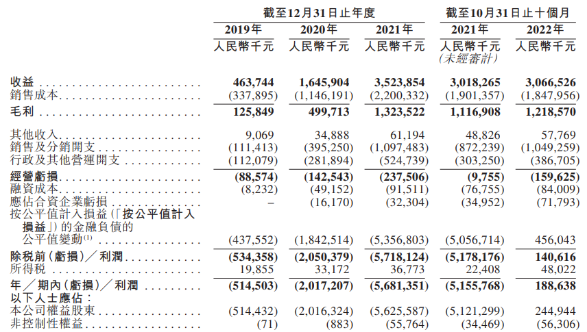 2018-2021年,KK集团的营收分别为1.55亿、4.64亿、16.46亿、35.24亿元,年内亏损分别为7948.5万、5.145亿、20.17亿、56.81亿元。