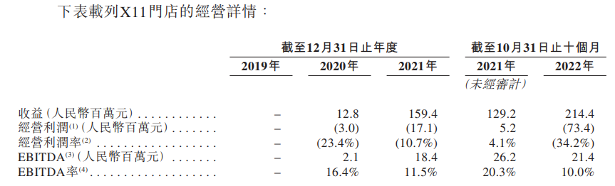 这里需要说明的是,X11门店的经营利润,定义为收益扣除门店层面产生的经营成本,包括已售出货品的成本、 员工成本、使用权资产折旧及其他租金相关开支、其他资产折旧及摊销、日常经营开支,以及分配予门店的相关中央管理以及物流及仓储开支。