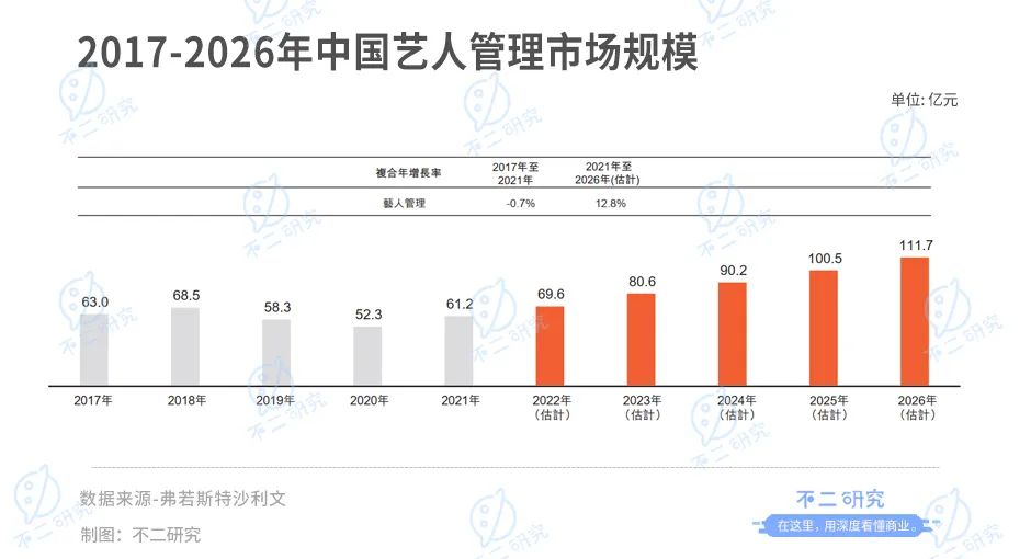 乐华娱乐在新版招股书援引弗若斯特沙利文报告称,按2021年艺人管理收入计算,其在中国艺人管理公司中排名第一;市场份额为1.9%。