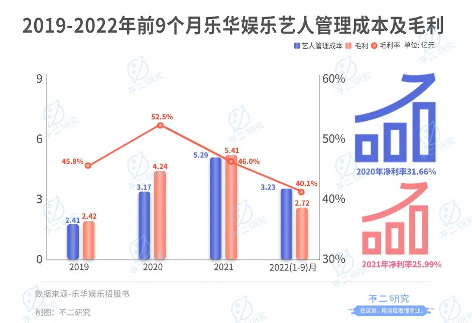 此外,据招股书显示,2019-2021年及2022年前9个月,艺人管理的成本分别为2.41亿、3.17亿、5.29亿和3.23亿,复合年增长率为33.43%和65.27%,2021年较2020年有所提高。