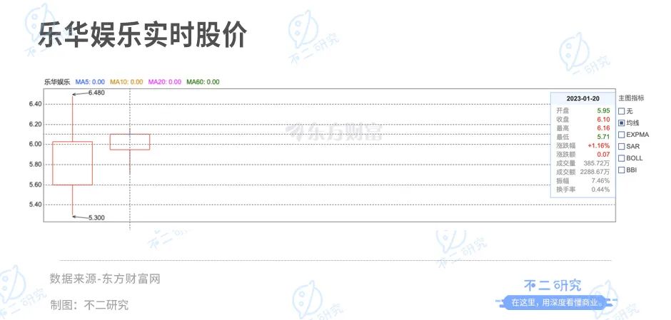 上市首日,乐华娱乐的开盘价为5.60港元/股,较发行价上涨37.3%,盘中一度涨超50%。截至1月20日12:00港股收盘,乐华娱乐报收5.86港元/股,对应市值50.99亿港元(折合人民币44.14亿元)。