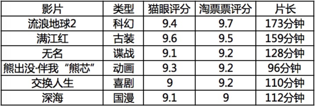从口碑的层面来看,今年春节档6部影片实现了全面破九的壮举,即所有春节档影片的猫眼、淘票票评分均突破9分。平均下来,春节档6部影片的猫眼评分为9.25分,淘票票为9.3,如此高水准的一届,已经真正在客观评分上拿到了最强春节档了。