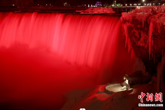 2022年2月1日,农历正月初一晚,加拿大著名旅游景点尼亚加拉大瀑布用灯光点亮“中国红”,庆祝中国农历虎年春节。余瑞冬 摄