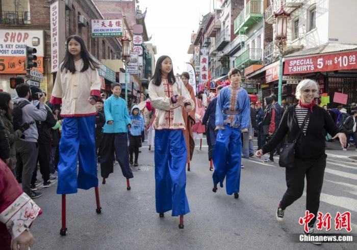 2020年1月18日,美国旧金山,民众身着中国传统服饰,在“中国城”上演舞狮、踩高跷等中国传统民俗表演,拉开庆祝春节系列活动的帷幕。刘关关 摄