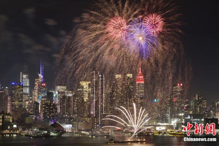 2020年1月23日晚,纽约哈德逊河上空燃放焰火、帝国大厦点亮红色彩灯,庆祝中国春节。廖攀 摄