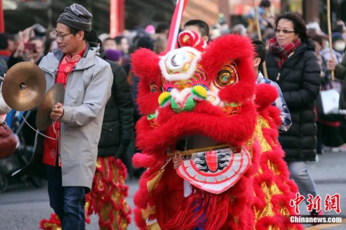 2020年1月26日,加拿大温哥华唐人街举行庚子鼠年华埠春节大游行。图为游行队伍中的醒狮。余瑞冬 摄