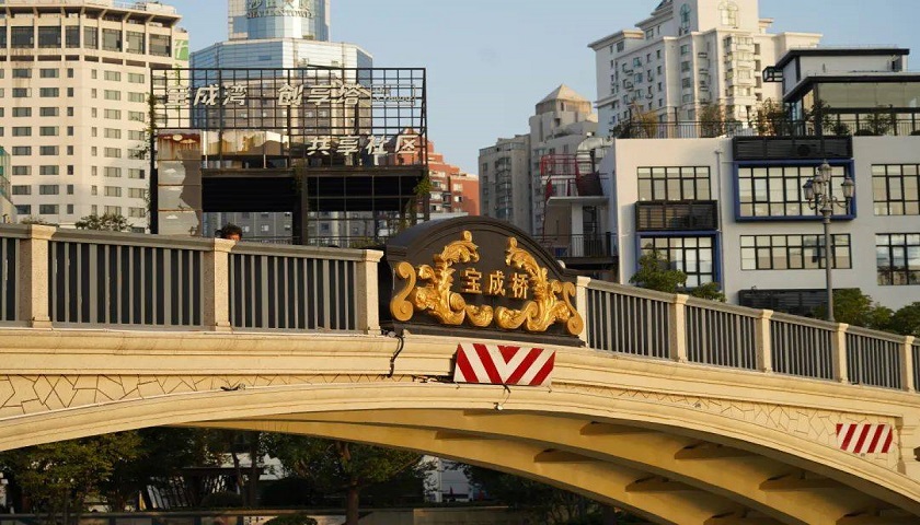 宝成湾,得名于宝成桥。这座人行桥连接着两岸的叶家宅路和光复西路。这里算不上交通主干道,但叶家宅路这一头在近些年越来越热闹。从宝成桥过河的,有来自新湖明珠城、苏堤春晓名苑这些大型社区的居民,还有回民小学的学生和家长,是这里人气的基础。随着创享塔开业、苏州河景观步道贯通,游客也发现了这片藏在长寿路闹市背后的河湾。