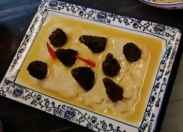 田园羊肚菌:此羊肚菌产自有天府水城之称的金堂,也是金堂县的地标农副产品,菜品釆用了,烹饪中酿的技法把牛肉制成牛肉馅酿入羊肚菌中,再把黄心土豆蒸熟打成泥,把酿好的羊肚菌播在土豆泥上,浇上汤汁即成。此菜成菜效果由如金堂县的田园风光,所以贯以田园羊肚菌的菜名,菜品据有健脾补虚,益气健胃,固表止汗的作用,含有丰富的维生素A,铁,烟酸,硒等。