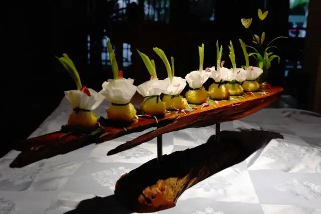 玉兰山珍锦囊:制作形态精致的锦囊外皮,馅采用金堂本地所产的羊肚菌、松茸菌、鸡菇、茶树菇、平菇五种菌类蒸制而成,再配以糖艺玉兰花,寓意古风玉兰君(菌)子的意境是一道匠心独具的象形菜品。