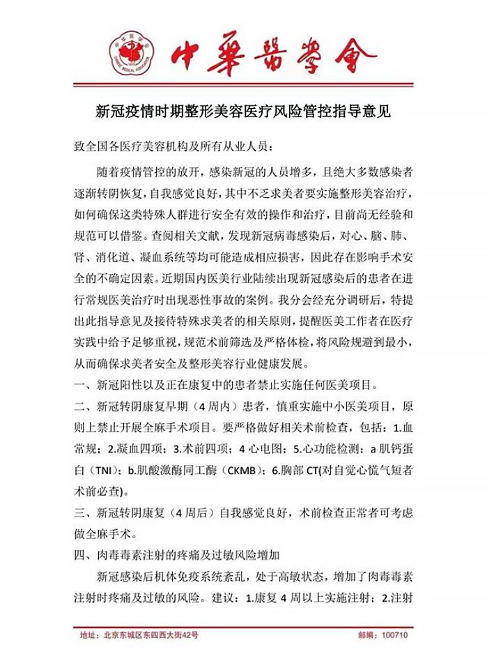 1月1日,中华医学会发布《新冠疫情时期整形美容医疗风险管控指导意见》,指出新冠阳性以及正在康复中的患者禁止实施任何医美项目,新冠转阴康复早期(4周内)患者慎重实施中小医美项目、原则上禁止开展全麻手术。