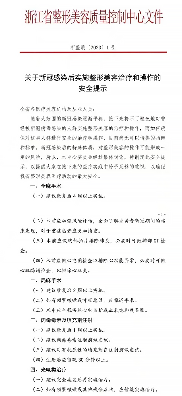 1月3日,浙江省医疗美容质量中心发布《关于新冠感染后实施整形美容治疗和操作的安全提示》(以下简称安全提示)显示,全麻手术建议康复四周后实施,局麻手术建议康复后2周以上实施。