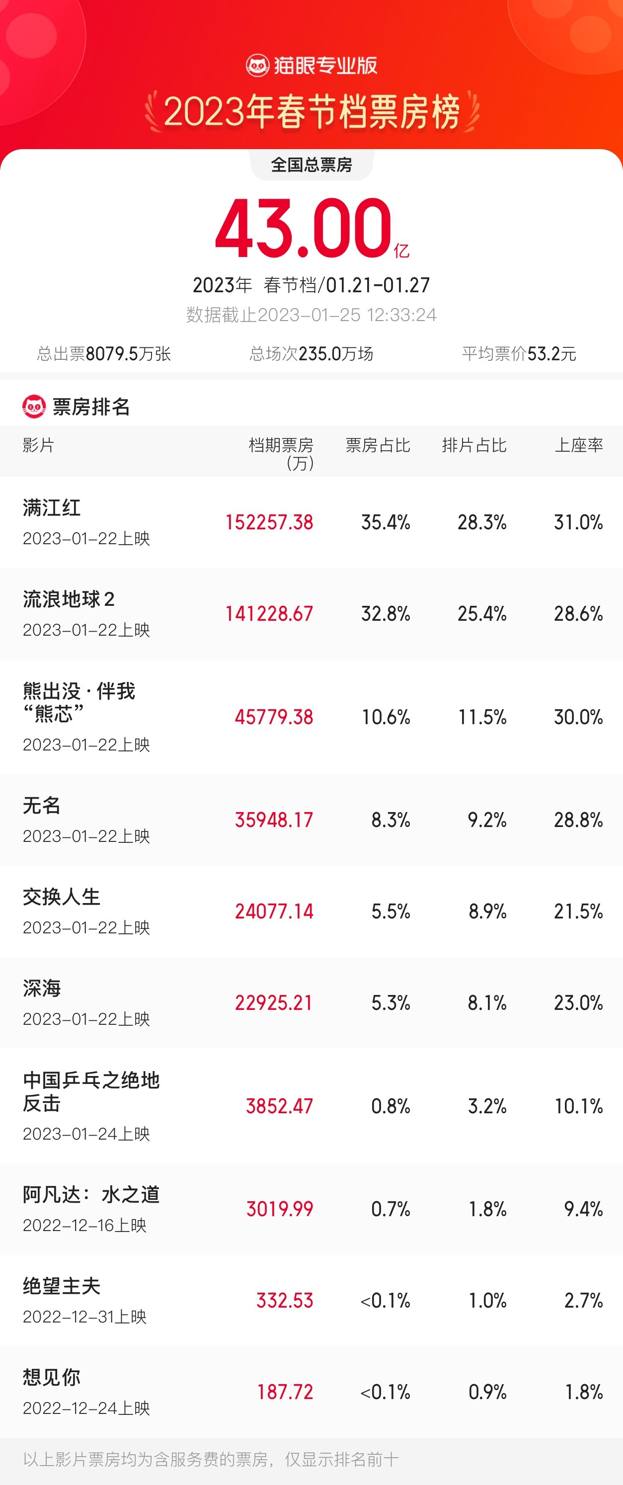 据猫眼专业版数据显示,2023年1月25日12时33分,2023年春节档(1月21日-1月27日)总票房(含预售)破43亿,《满江红》总票房超15亿元居首,《流浪地球2》《熊出没·伴我“熊芯”》分列春节档票房二、三位。