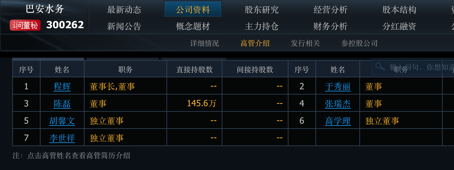回顾这第(九)项和第(十)项,巴安水务曾采取累积投票的方式选举了程辉、张瑞杰、陈磊、于秀丽为公司第五届董事会非独立董事,任期自股东大会选举通过之日起三年;选举了李雪、高学理、胡馨文为公司第五届董事会独立董事。上述7人也构成了如今巴安水务的董事会,程辉为董事长,于秀丽是财务总监。