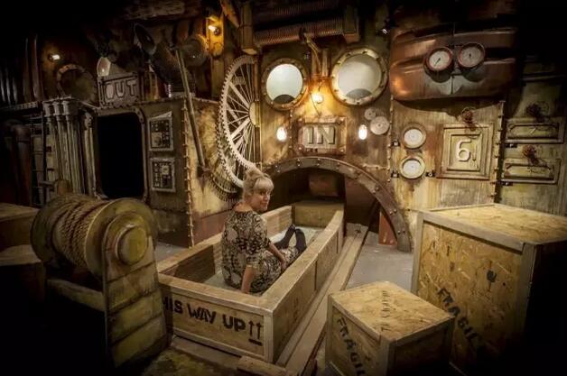 紧接着你进入不同的空间,每个空间都有特别的演员端上对应的菜式,比你会体验到在丛林环境中寻找鸟巢(而里面装着你即将吃到的前菜沙拉碗),一边听着水手在荒岛中读故事一边被分到鸡尾酒,或者在一个模拟机舱的房间中从一个边唱边跳的变性人手里接过甜品。