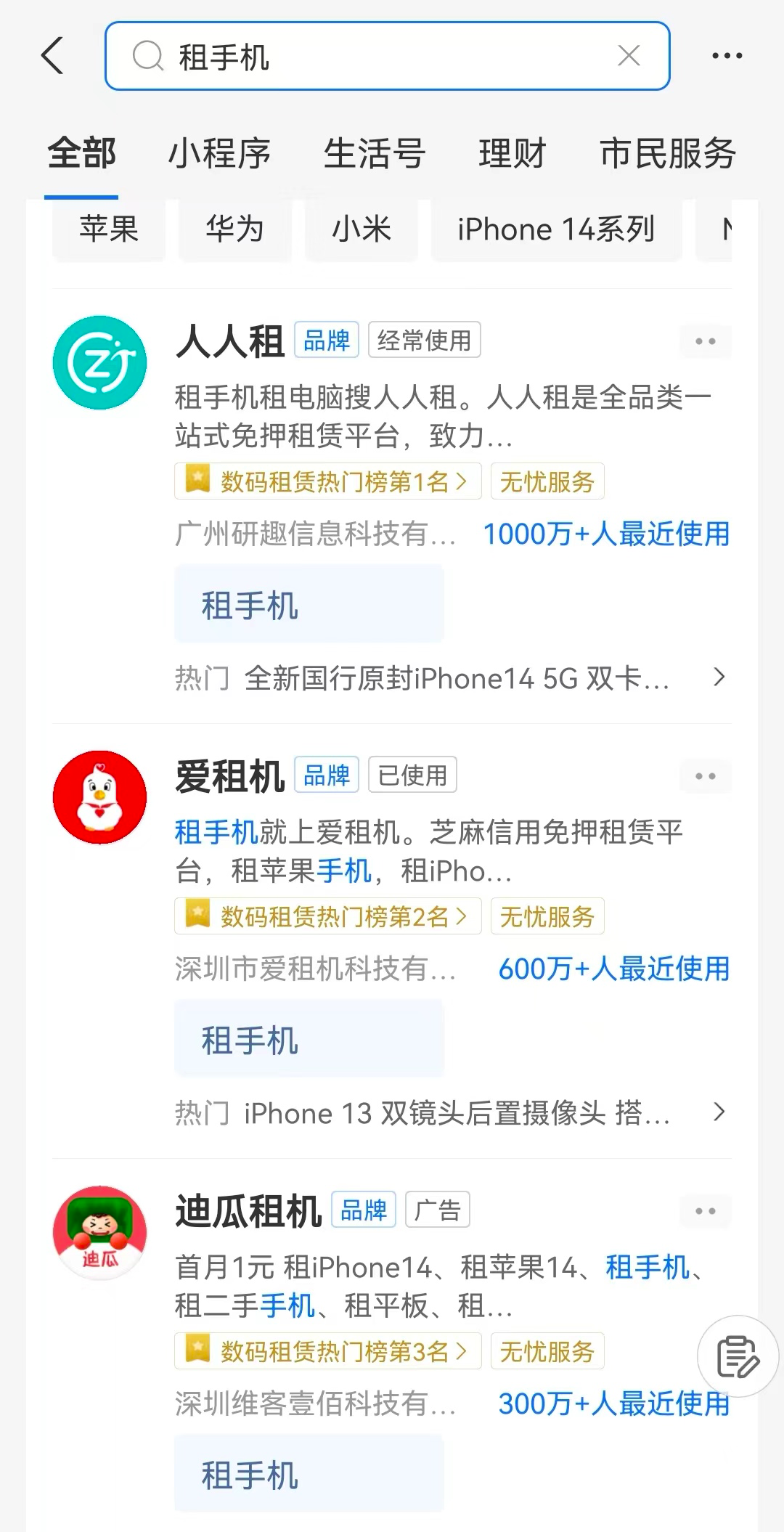这个市场上,一面是入场分蛋糕者增加,另一面是尝试租手机的用户也随之增加。通过支付宝芝麻分,用户就可以享受免押金,租手机的门槛被降低,用户规模也不断扩大。截至2023年1月,支付宝手机租赁相关的小程序中,人人租显示最近使用人数超过了1000万人,爱租机有600万人,迪瓜租机有300万人,优好物、零零享租等都有超200万人使用。