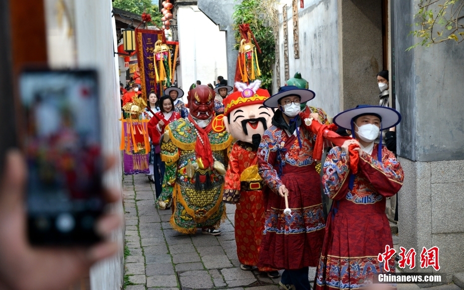 福建省泉州市晋江梧林传统古村落,“电音三太子”的表演引得众多游客纷纷互动拍照,体验现代与传统交融的浓浓年味。赖进财 摄