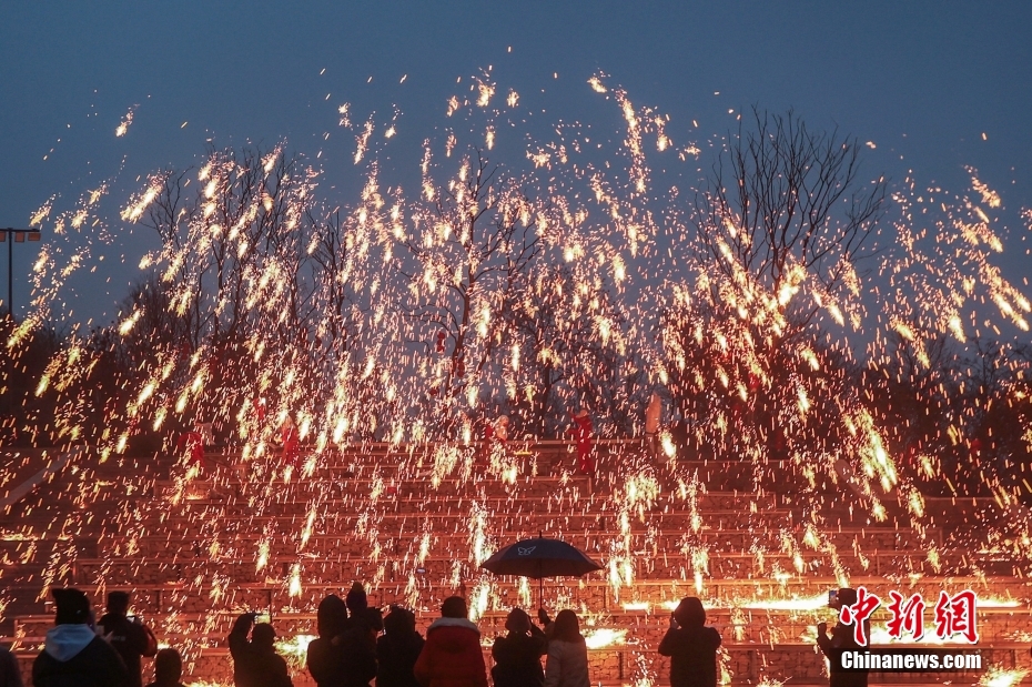 江苏盱眙,国家级非物质文化遗产打铁花上演。春节期间,千年古城江苏盱眙第一山历史文化街区举办“逛第一山古城 品老街味道”系列文旅活动。泱波 摄