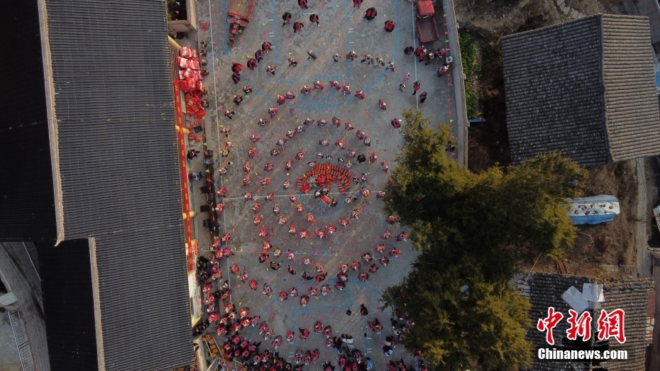 浙江台州,金竹溪村锣鼓喧天,人头攒动,当地安山村舞龙队400多村民舞起一条数百米长的板凳龙,祈愿新的一年五谷丰登、风调雨顺。陈月明 摄