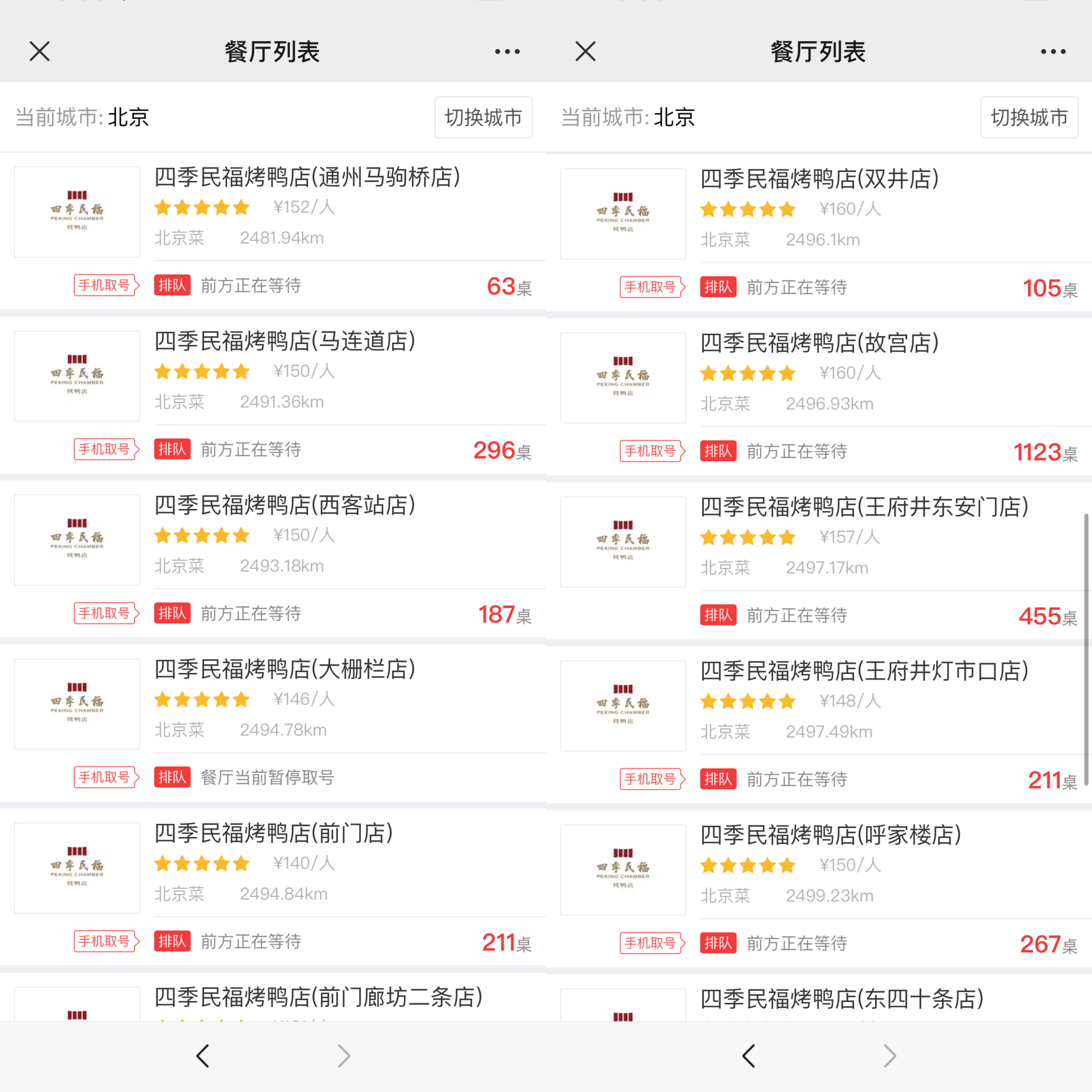 “不要在过年期间去故宫,会饿发财的!”在小红书、抖音等社交平台,不少消费者都在描述旅游区热门餐厅一位难求的火爆场景。界面新闻记者在四季民福烤鸭公众号上看到,初四下午不到5点,其故宫门店已经等位1123桌——这家门店以可看到东华门与筒子河的景观位而知名,从而成为故宫附近的网红打卡地,而临近的王府井东安门店与灯市口店,等位也在455桌与211桌不等。