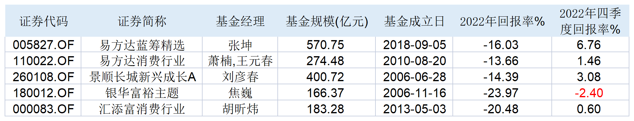 从业绩来看,上述5只基金在2022年均以负收益告终,但四季度,因为消费板块的强势反弹净值得以翻红。从规模来看,截至去年年末,5只基金均在百亿以上,其中张坤管理的易方达蓝筹精选为570.75亿元,景顺长城新兴成长为400.72亿元,易方达消费行业为274.48亿元,银华富裕主题和汇添富消费行业的规模分别为166.37亿元、183.28亿元。