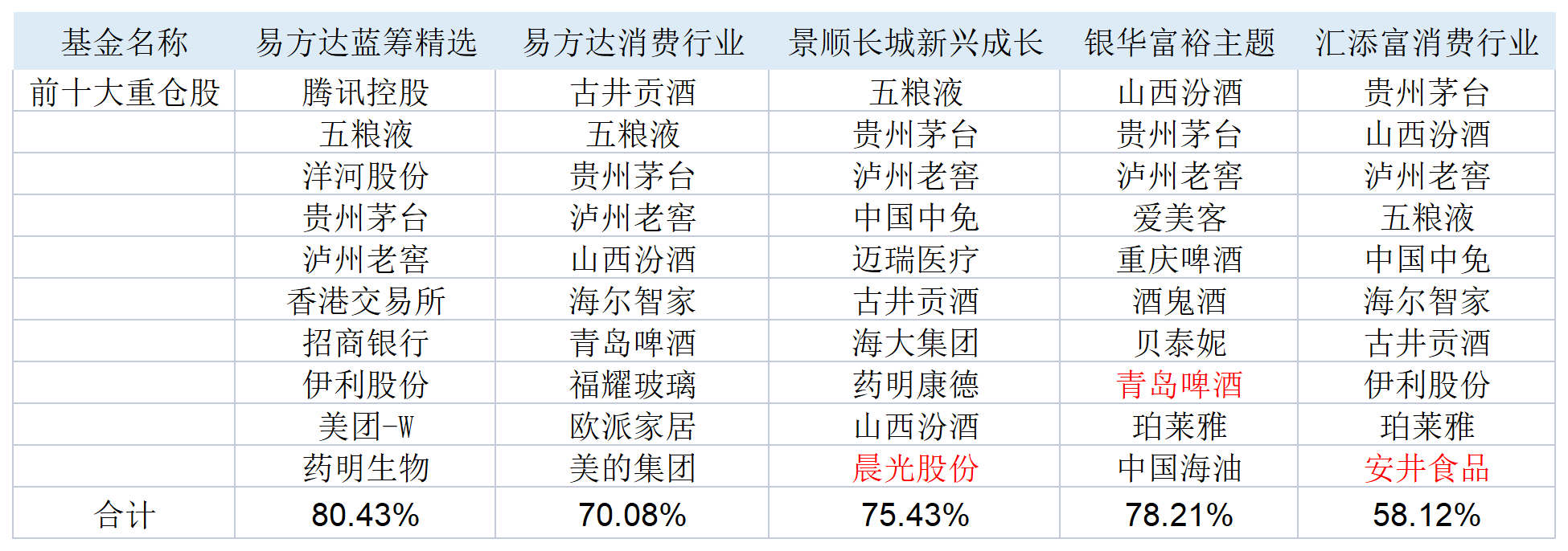 从持仓来看,5只基金的集中度仍较高,易方达蓝筹精选的前十大重仓股合计占比为80.43%,易方达消费行业、景顺长城新兴成长、银华富裕主题的前十大重仓股占比也在70%以上。汇添富消费行业的前十大重仓股持比为58.12%。