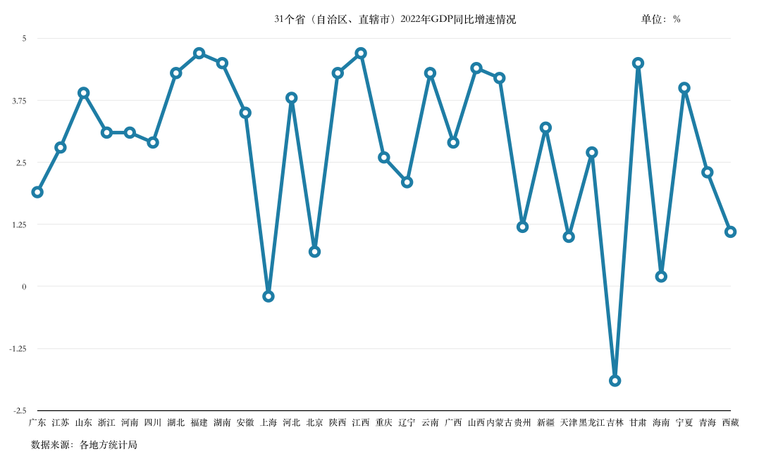 几家欢乐几家愁,和上述省份相比,部分地区的表现不尽如人意。增速排在后五位的分别为吉林、上海、海南、北京和天津,GDP同比增速分别为-1.9%,-0.2%、0.2%、0.7%和1.0%。