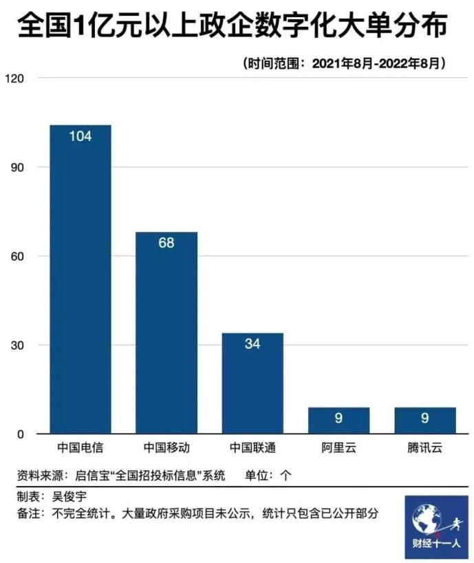另一方面,政务云市场还有国资云这个“天选之子”。据统计,自2021年8月以来的一年中,中国电信获得的政企数字化大单104个,而阿里同期只有9个。不难看出,在技术满足政企要求的前提下,“根正苗红”的运营商云,显然有着更大的优势。