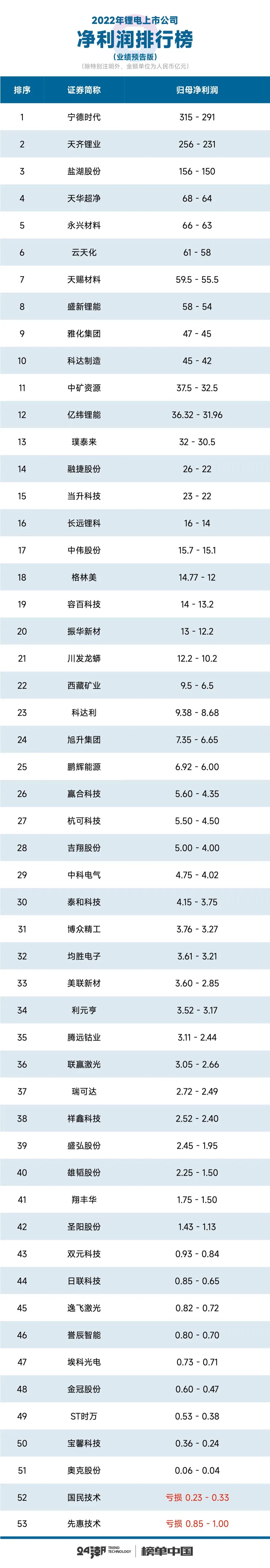 统计数据显示锂电池行业强者恒强的马太效应愈发凸显,2022年前十家企业归母净利润合计约为1053.5亿元-1131.5亿元,占整体比重超77%;其中前三名企业宁德时代、天齐锂业和盐湖股份归母净利润均超100亿大关,三者归母净利润合计约为672亿元-727亿元,近乎占据半壁江山。