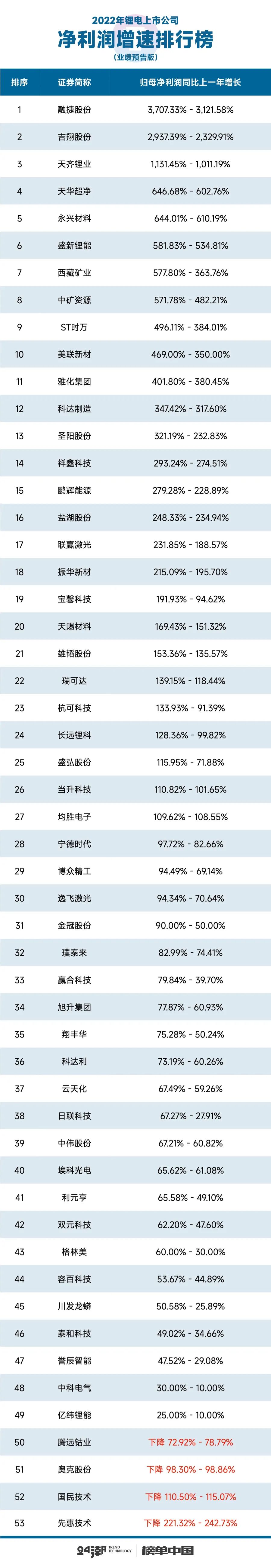 从成长角度看,全年49家企业归母净利润实现增长,其中约45家企业增幅在50%以上,近27家企业实现了100%以上高速增长,增长最快的三家企业分别为融捷股份、吉翔股份和天齐锂业,三家企业主营业务均涵盖 “锂矿/锂盐” 业务。