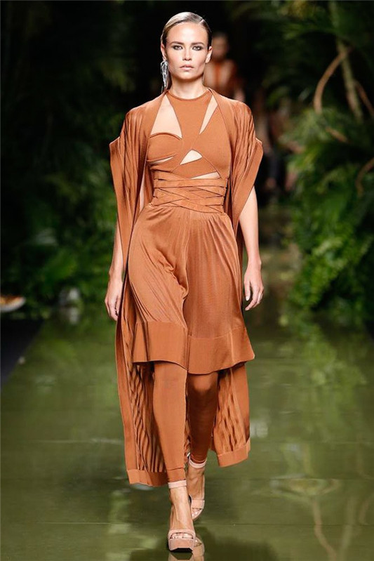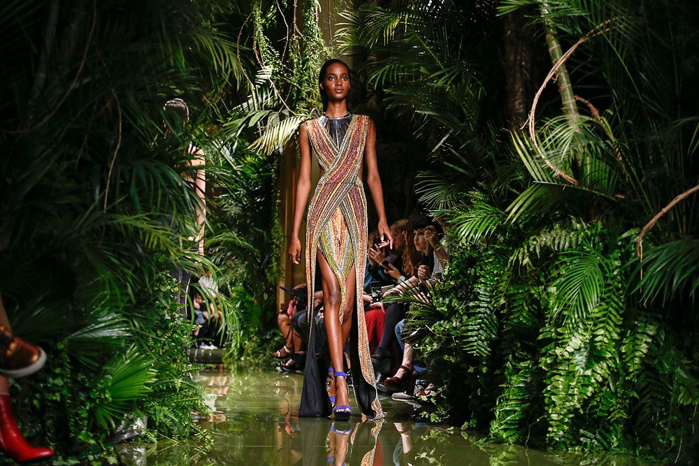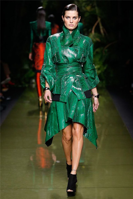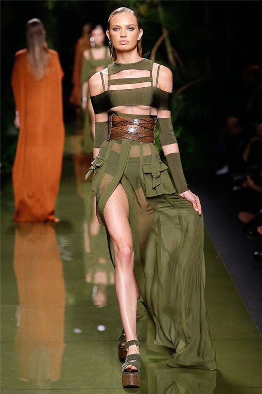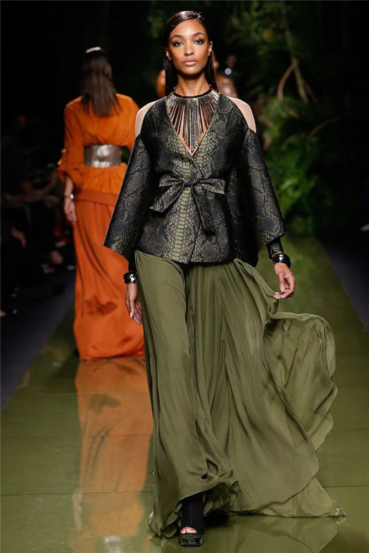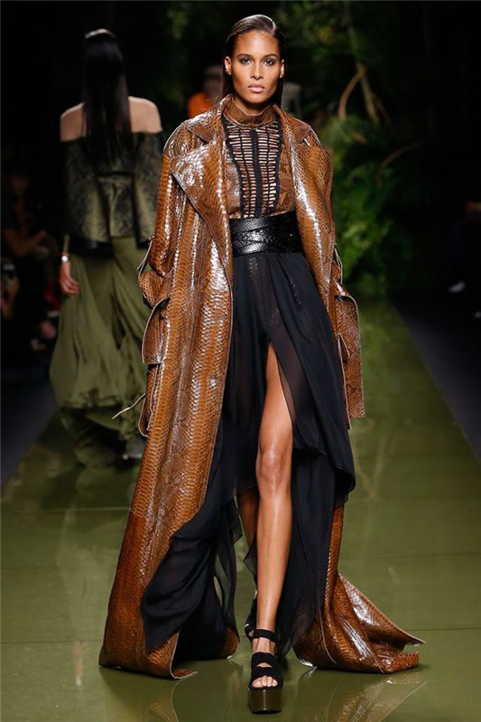 对于刚刚结束的2017春夏女装系列,Rousteing将巴黎的Potocki酒店打造成了热带雨林。没错,有点似曾相识。一个小型交响乐团隐藏在酒店角落里为这场秀进行助兴表演。过往设计中常见的大面积刺绣,钉珠和编织细节如今都被设计师视为“所有不必要的护甲”,转而被更为宽松,略带运动风格的飘逸服饰所代替。新作品里最大的元素就是对蟒蛇皮和蛇纹的使用。极度奢华的拖地蟒蛇皮大衣和军装外套,蛇纹印花的莱卡弹力紧身裤......腹部被掏空的紧身胸衣展示了性感的胸下地带,这是Rousteing这一季着重强调的新式性感带。