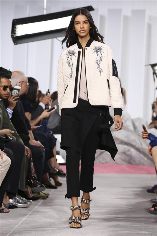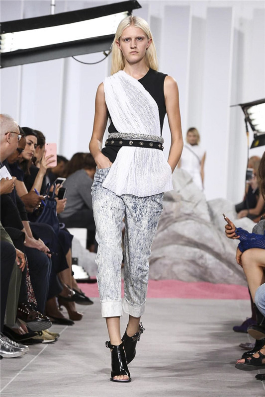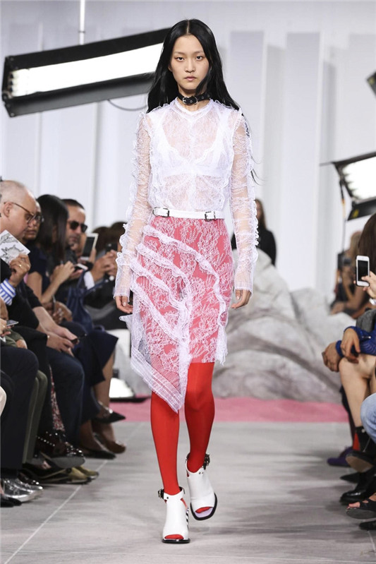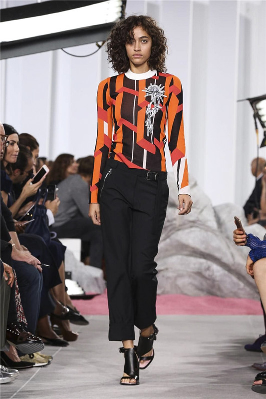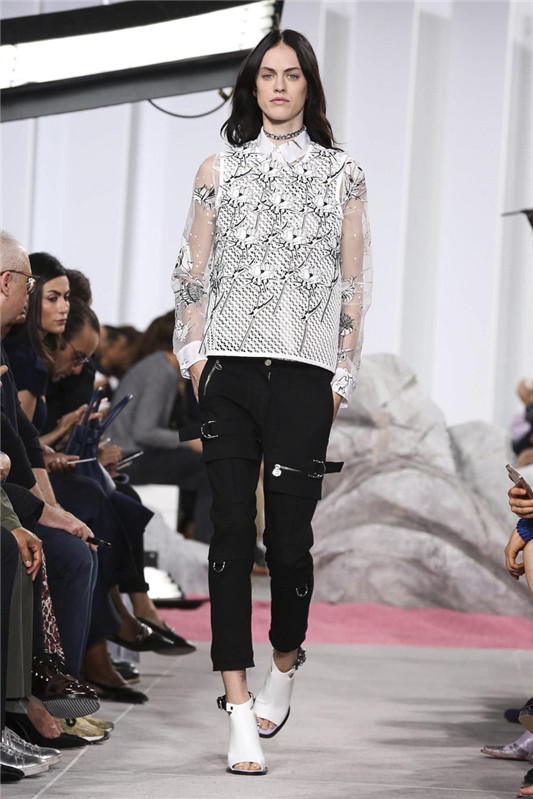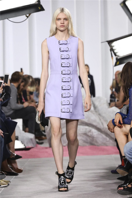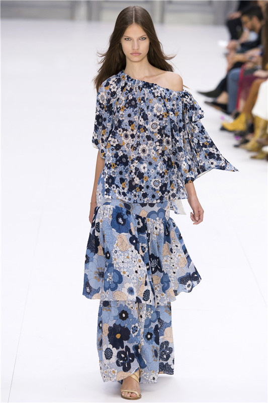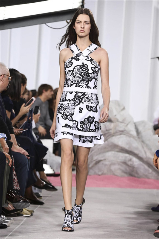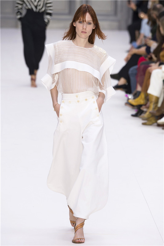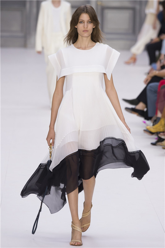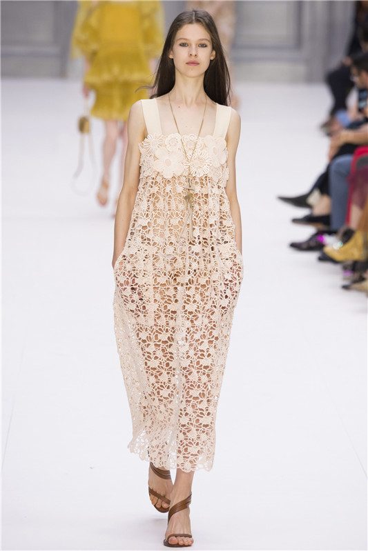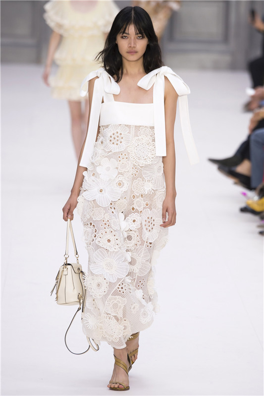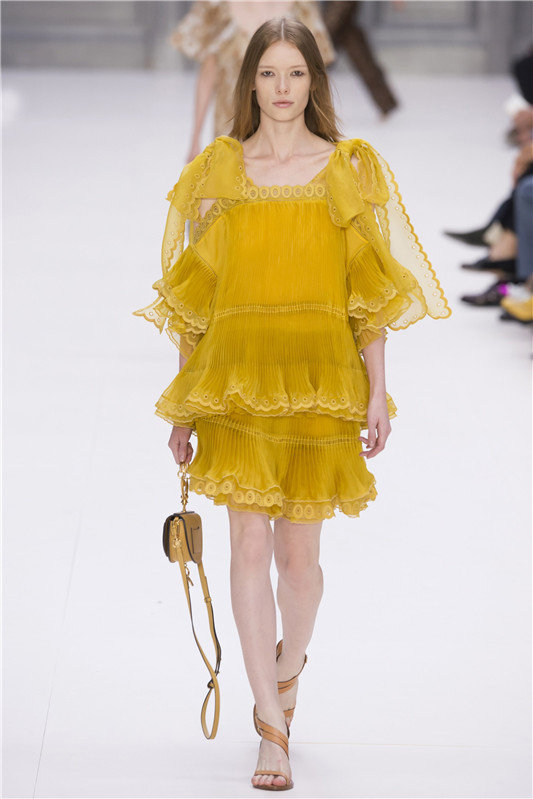 设计总监Clare Waight Keller言简意该地总结这场发布会的全部精华:这是一个回到品牌起源、展现法式风格简约面的系列。有着完美的剪裁比例,且毫无刻意感。这的确是Chloé始终不变的特色。方正的廓形、清爽的材质传递出强烈春光气息,尤其是最后那几套造型,洁白的蕾丝宽肩带连衣裙、黄色雪纺迷你蛋糕裙,以及花卉印花棉布裙......少女的纯真无邪都留在了模特走过后的空气里了。