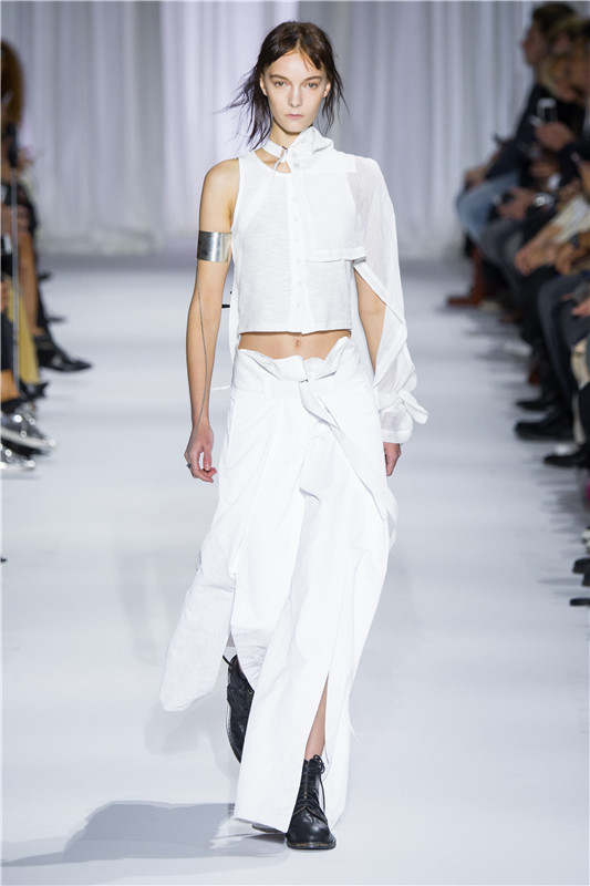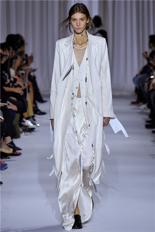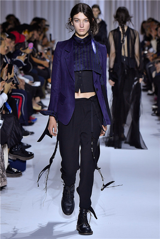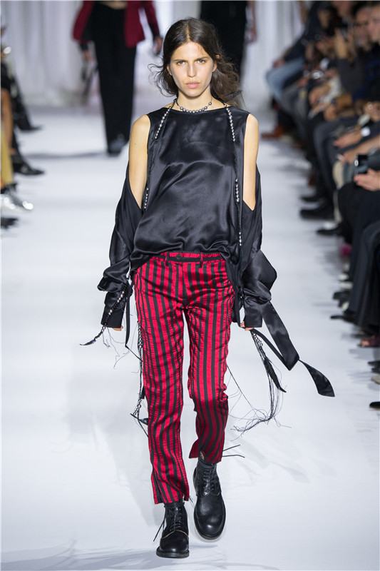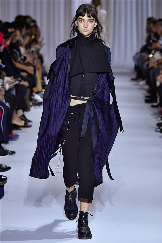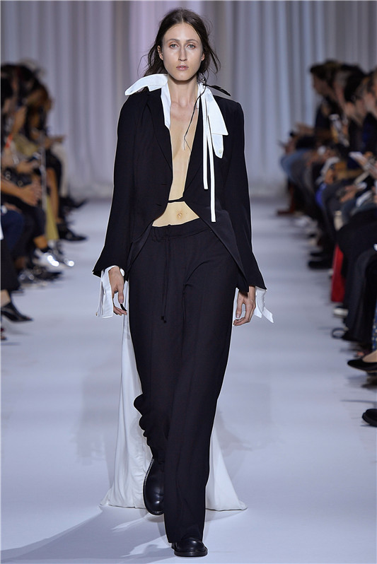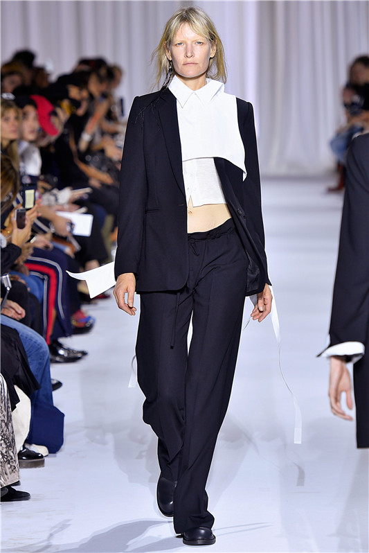 但“多余”的部分不光是前排观众翘起的二郎腿,在艺术指导Sébastien Meunier指导下的新一季Ann Demeulemeester女装,尽管主要廓形是标志性的长裤套装(40套新作全部由裤装组成),但藏在这一套套裤装上的解构式细节之多,或许就是这是让这场秀延误将近40分钟的原因所在:这些带有Strap(束带)、腰封以及犹如盔甲或者医疗康复用护臂的袖饰等单品,可能让专业的穿衣工都手忙脚乱。不过好在复杂的细节并不显得喧宾夺主,它们依旧融合在Ann Demeulemeester标志性的长外套、宽松的衬衣和条纹图案之中,而不规则的衬衣造型,则让人想起该品牌1997年春夏中的相似之作。