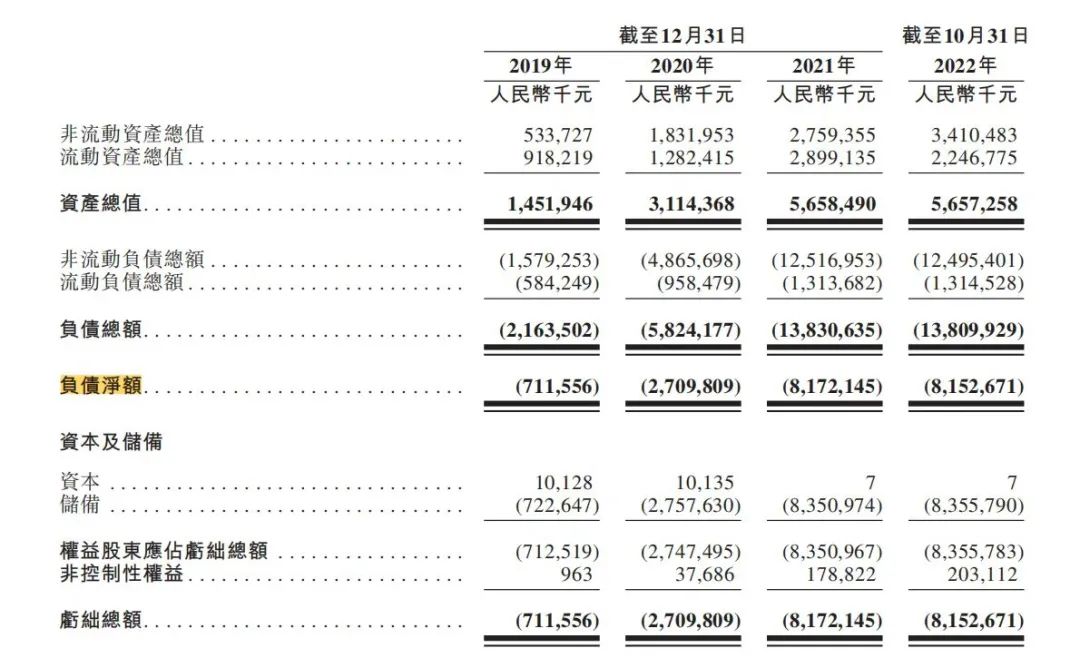 另值得关注的是,KK集团还存在着高额负债的情况。招股书显示,截至2019年1月1日,KK集团录得负债净额为1.01亿元,主要是该公司截至同日的累计亏损1.26亿元,及于2016年、2017年及2018年发行普通股的所得款项2500万元所致。截至2019年、2020年、2021年12月31日,KK集团的负债总额分别为21.64亿元、58.24亿元、138.31亿元,负债净额分别为7.12亿元、27.1亿元、81.72亿元。以此来看,KK集团的负债规模呈现几何式增长。