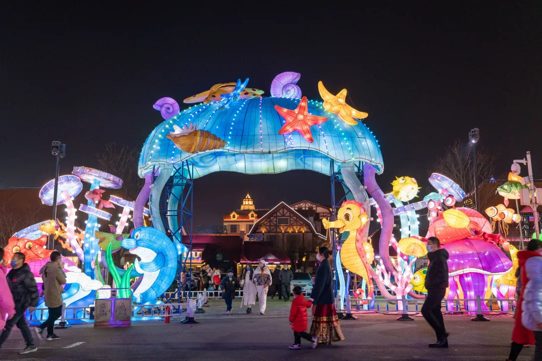 在金沙滩啤酒城,造型优美、做工精细的花灯组成了美丽的灯海,将金沙滩啤酒城装扮得璀璨夺目,吸引市民游客纷至沓来,感受西海岸不一样的年味儿。