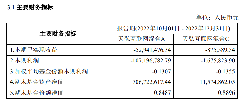 天弘互联网混合披露2022年四季报,第四季度该基金利润合计亏损1.09亿元;已实现收益合计为负5381.71万元。